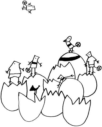 Навън слънцето блести, птици всякакви хвъркат, насекомото и то хвърка -- блажена работа. Оглеждам се и виждам, че край мен в гнездото лежат още яйца и от тях се носи писукане. Навеждам се над най-близкото яйце и почуквам с човката също като по морз: чук ... чук-чук, и врабецът, дето е вътре, ми отвръща с почукване и ми обяснява, че иска да излезе на свобода. Запретвам се аз тогава и като започвам един бой с човката, врабецът вътре се окуражи, щом разбра, че му идва подкрепление, почна и той да удря и подир малко затворът се превърна в развалини, а ние двамата ликувахме, застанали на колене в развалините.