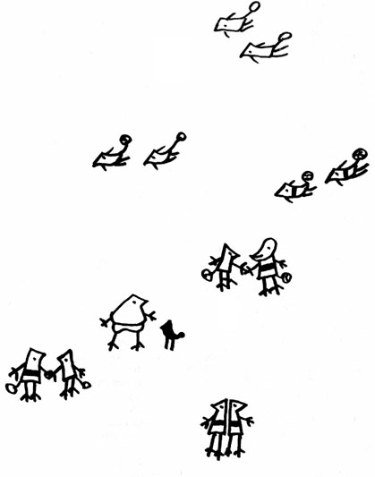 Гледам, една сутрин рано-рано всеки от нас стои на ръба на гнездото и се сили да възпее живота си. Разбира се, най-лесно е на Пиук, щото си има природна дарба да възпява. Но ние, другите, макар н да нямаме природна дарба, му ударихме голямо възпяване и дни наред ехтяха песните ни. Чирик-чирик, чирилик-чик. Джифф, Фррррр и хайде към реката, та да донесем вода в перушината си.