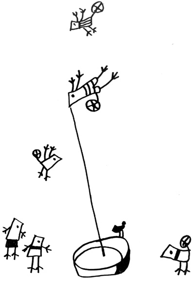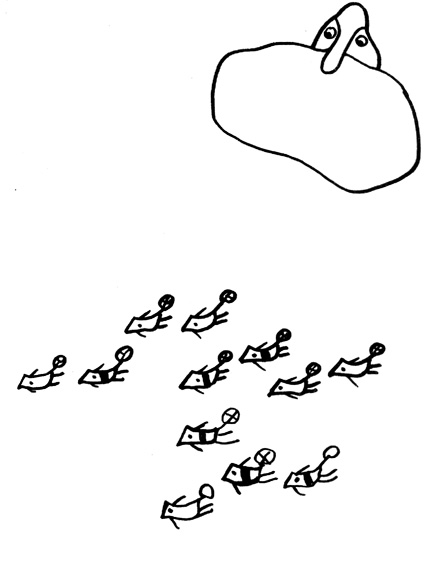 Един по един ние се разпръснахме всеки по своята работа и чак привечер, като се връщахме уморени кой пеша, кой с подфъркане, чуваме, че нещо откъм небето започва да свисти: Фюииии! -- прелетя край нас и тупна на земята. Спуснахме се всички долу на земята и гледаме, че това е сламката на Мититаки, която той донесе от птичата ривиера. Това беше единственото, останало след експлозията на балонската дъвка. Като видяхме сламката, всички до един се натъжихме много, а смрадовранката пророни сълза, после взе новата фльонга и избърса с нея сълзата, но ни каза ау, ни плесна с ръце; дори Драги ми господине не направи обичайната си забележка, ами се сви в гнездото си и само промърмори многозначително под нос: Хм! Хм!