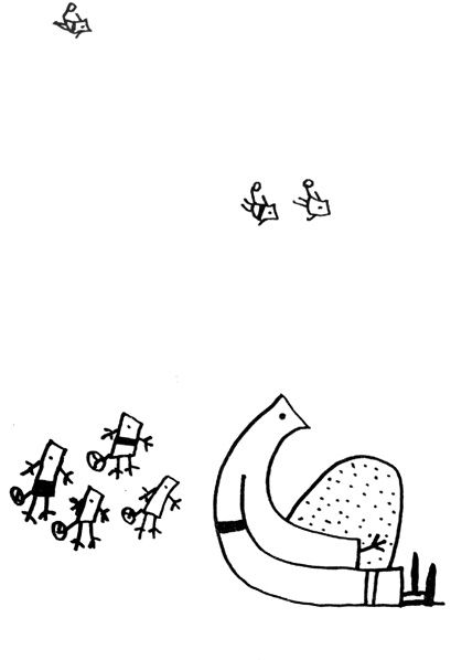 Та тя легна да мъти, а ние подфъркаме наоколо и я шпионираме. Кой знае какво за шпиониране нямаше, но за всеки случай шпионирахме, а най-вече с тая работа се занимаваше Пешеходецът, който си подсвирква с уста. На него това най-много му се удава, щото свраката едва ли щеше да се подсети, че той я шпионира. Пешеходецът, който си подсвирква с уста си върви най-безобидно и с най-разсеян вид подсвирква, ще помислиш, че е човек, тръгнал просто да си подсвирква. Той обаче с едно око подсвирква, а с другото око шпионира свраката. А свраката, нали е глупава, хич даже и не може да се подсети, че я шпионират. Какво ли си мисли тя: Това е врабешки народ, по цял ден гони насекоми, мигар ще седне да ме шпионира!