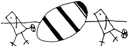 Ето колко голям шум се вдига за едно яйце -- нищо и никаква работа. Ако врабчето трябва да вдига шум за своята работа, то няма да му стигне викане, ами с оръдие трябва да гърми. Затова само с един иглен връх то почиства три декара кожа. Докато се върти из двора и търси някоя загубена троха, врабчето вижда, че от къщата излиза Илия, носи свинската кожа да я опъне на стената на къщата. Той туря сенарска ритла, качва се по нея, кове с пирони, опъва, премества ритлата, пак кове, пак опъва кожата, после я натрива със сол и трици и кога слиза от стълбата, в двора влиза негов роднина. Бре, чичи -- вика роднината. -- каква е тая свинска кожа! То има три декара кожа! Че как да няма три декара -- казва му Илия, -- свинята тая година ми с изяла седем каруци тикви, отделно кукуруза и другите работи!