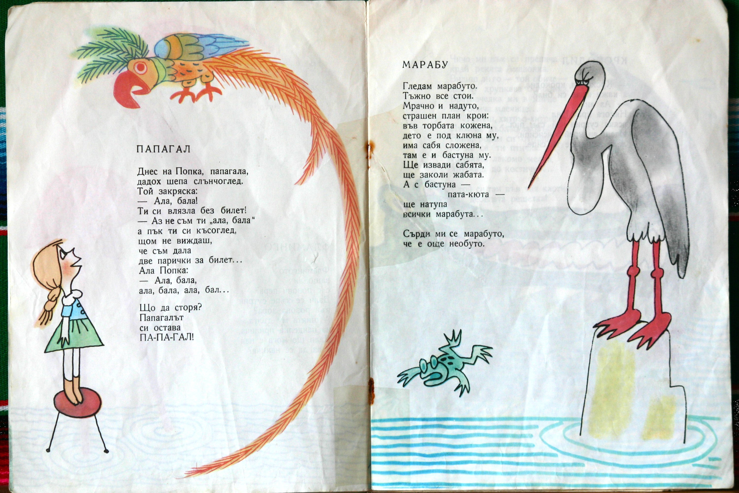 МАРАБУ Гледам марабуто. Тъжно все стои. Мрачно и надуто, страшен план крои: във торбата кожена, дето е под клюна му, има сабя сложена, там е и бастуна му. Ще извади сабята, ще заколи жабата. А с бастуна - пата-кюта - ще натупа всички марабута... Сърди ми се марабуто, че е още необуто. |