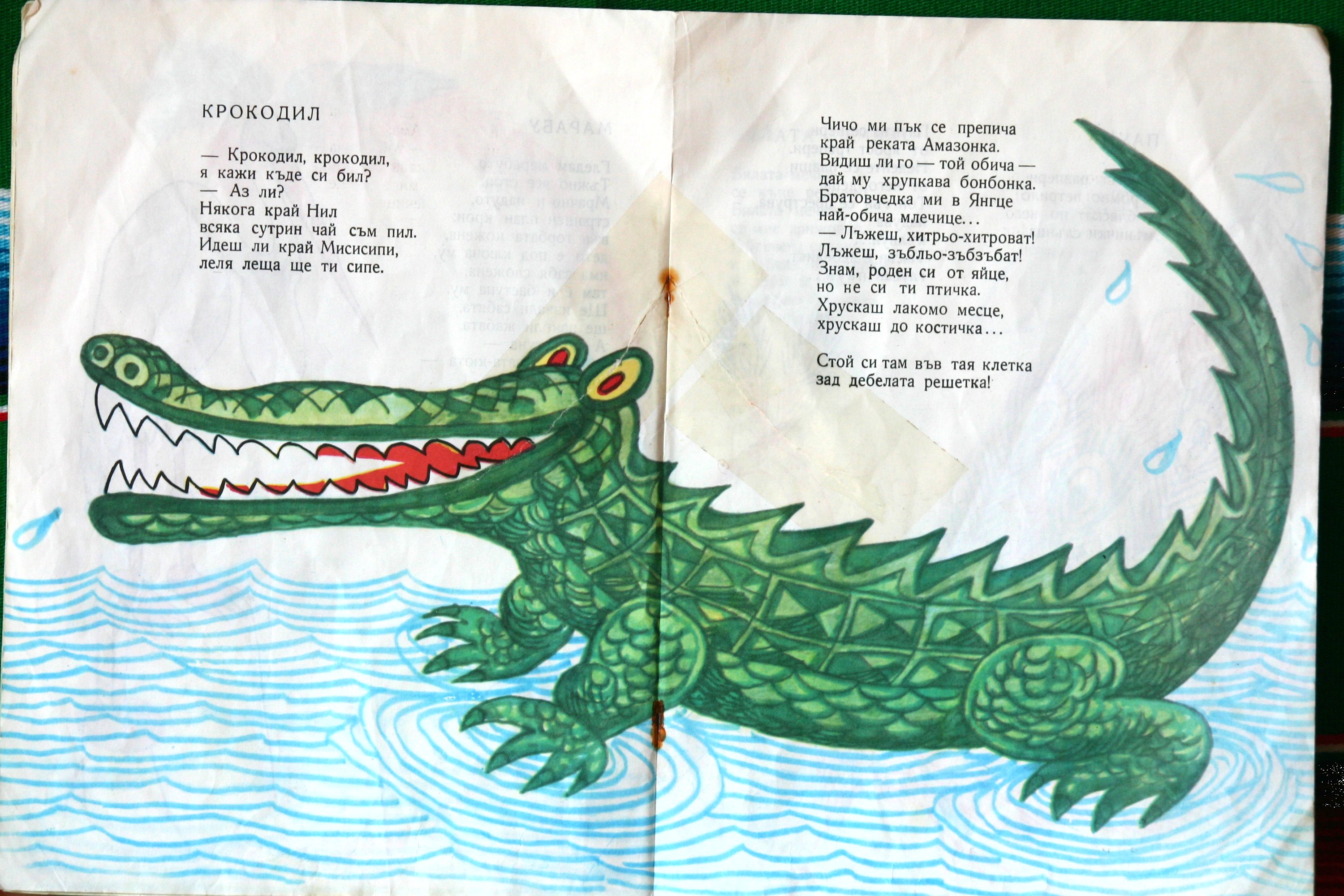 КРОКОДИЛ - Крокодил, крокодил, я кажи къде си бил? - Аз ли? Някога край Нил всяка сутрин чай съм пил. Идеш ли край Мисисипи, леля леща ще ти сипе. Чичо ми пък се препича край реката Амазонка. Видиш ли го - той обича - дай му хрупкава бонбонка. Братовчедка ми в Янгце най-обича млечице... - Лъжеш, хитрьо-хитроват! Лъжеш, зъбльо-зъбзъбат! Знам, роден си от яйце, но не си ти птичка. Хрускаш лакомо месце, хрускаш до костичка... Стой си там във тая клетка зад дебелата решетка! | |