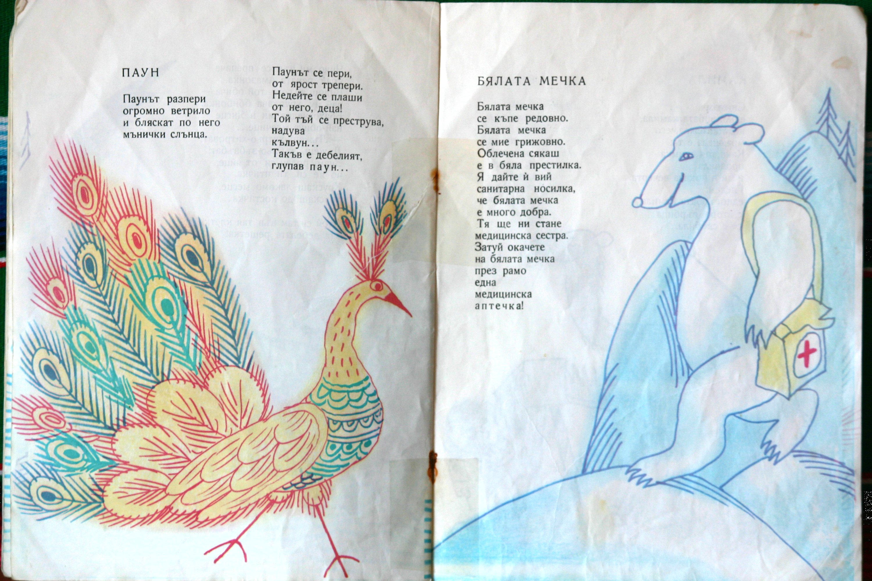 БЯЛАТА МЕЧКА Бялата мечка се къпе редовно. Бялата мечка се мие грижовно. Облечена сякаш е в бяла престилка. Я дайте й вий санитарна носилка, че бялата мечка е много добра. Тя ще ни стане медицинска сестра. Затуй окачете на бялата мечка през рамо една медицинска аптечка! |