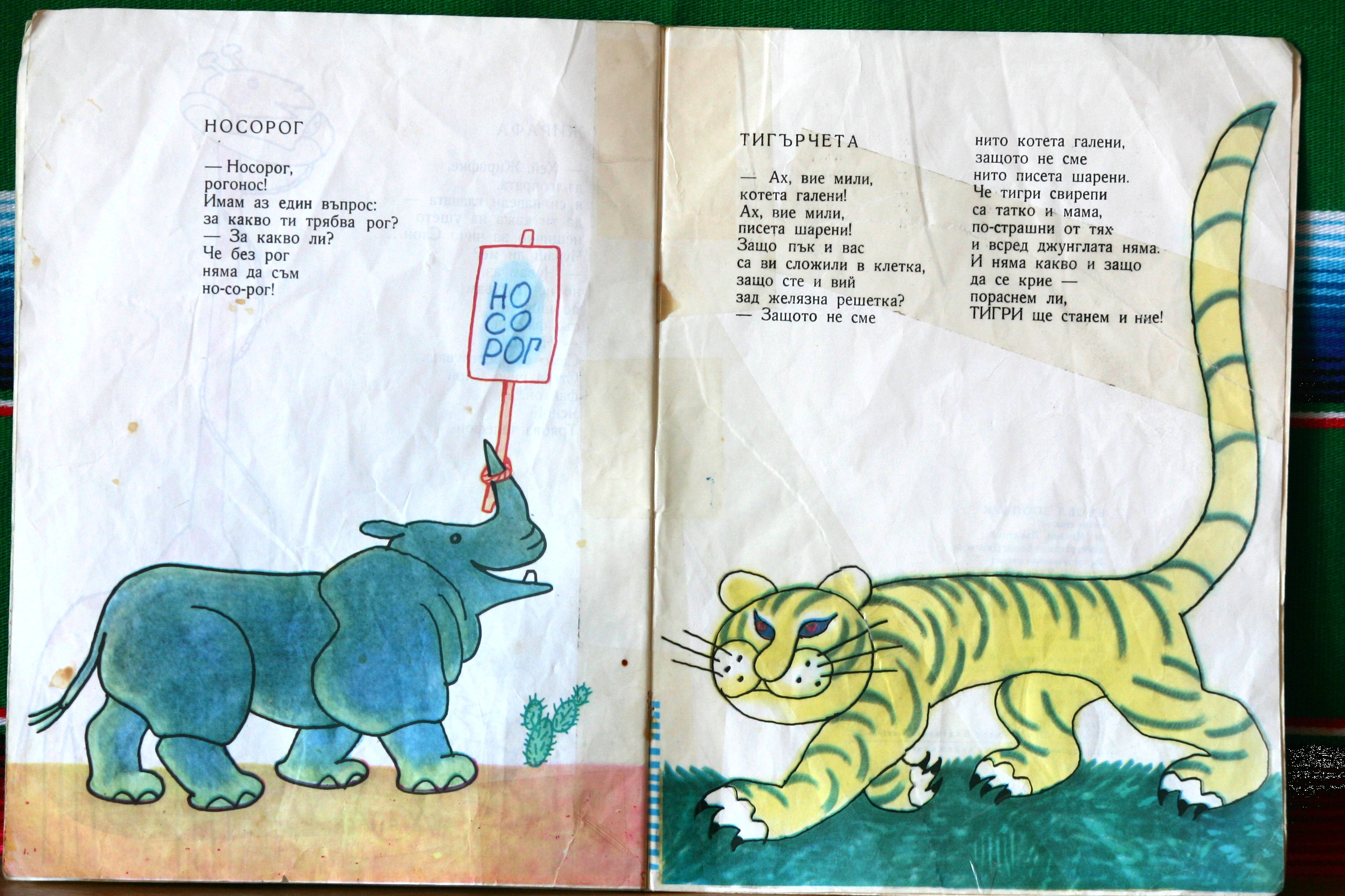 ТИГЪРЧЕТА - Ах, вие мили, котета галени! Ах, вие мили, писета шарени! Защо пък и вас са ви сложили в клетка, защо сте и вий зад желязна решетка? - Защото не сме нито котета галени, защото не сме нито писета шарени. Че тигри свирепи са татко и мама, по-страшни от тях и всред джунглата няма. И няма какво и защо да се крие - пораснем ли, ТИГРИ ще станем и ние! |