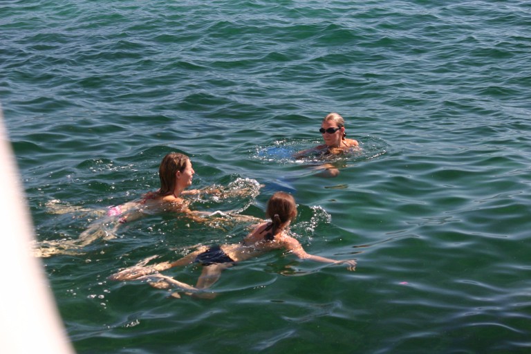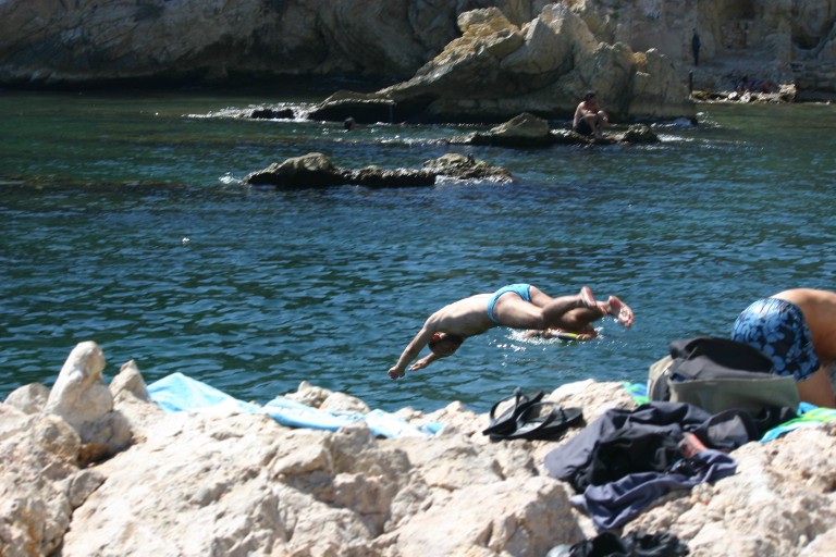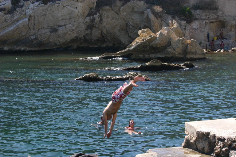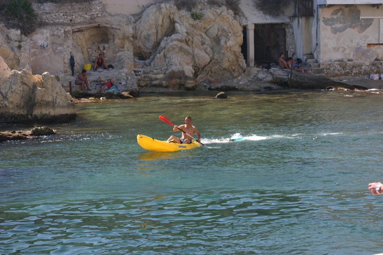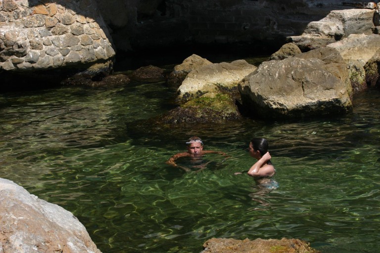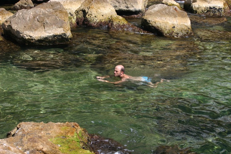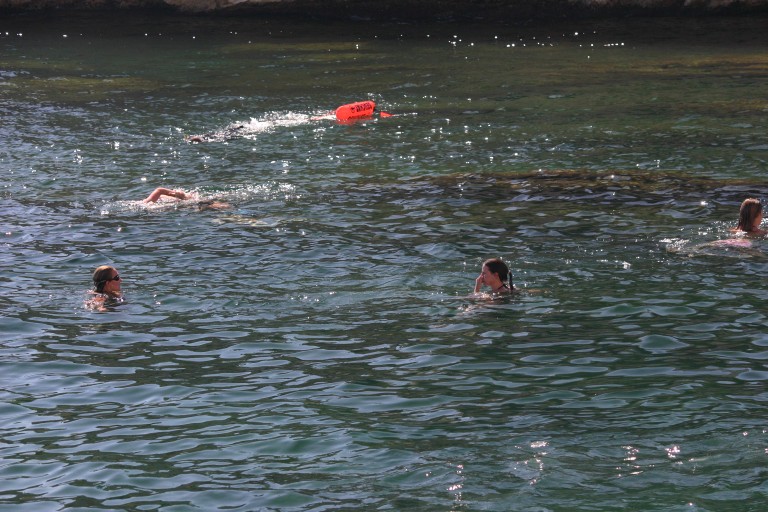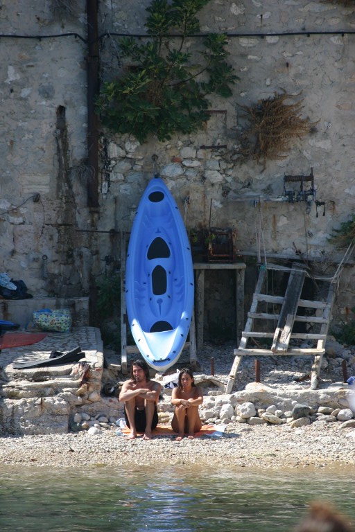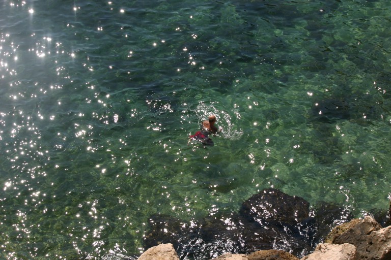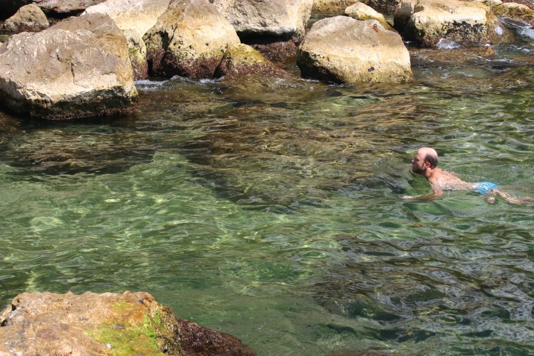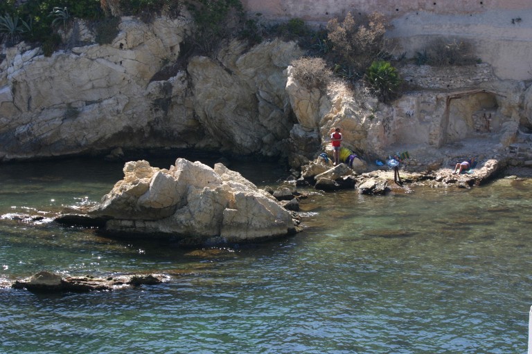 доста начупен бряг, с къде изкуствени къде естествени буни, заливчета без пясък, и много бистра и много солена вода